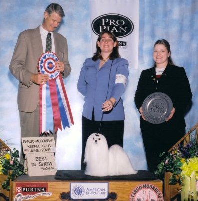 Marc is shown here winning his first All Breed Best In show under judge Mr Jon Cole. Marc did not start his specials career until the end of February at just 16 months of age. In just his first 7 months Marc is not only a Multiple BIS winner against Top Toy Competition, now the #1 Maltese All Systems and in the Top 10 Toys for 2005. He is owned by Angie Stanberry, Barbara Davis, Linda Nelson and Sheila Riley and bred by Angie Stanberry - Divine Maltese - and Sheila Riley - Maltangel Maltese. Marc is being sponsored by Arlene Muzquiz and PurePaws.net. Look for Marc in the ring across the country!!